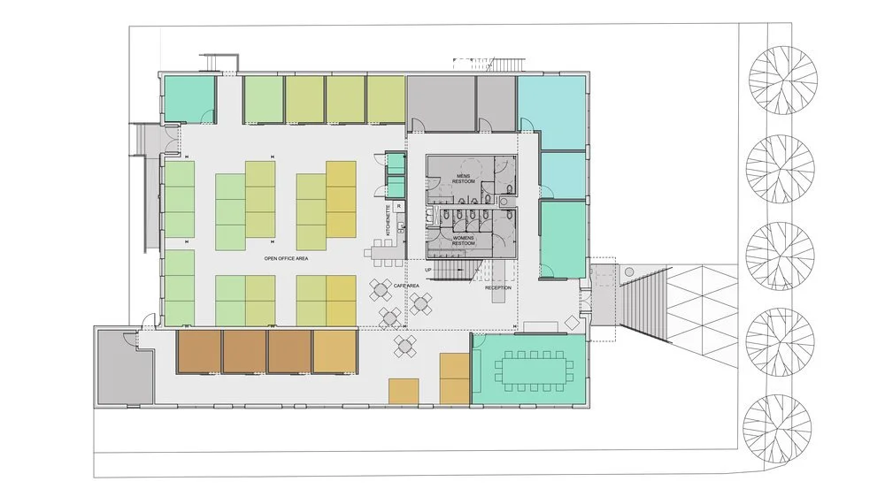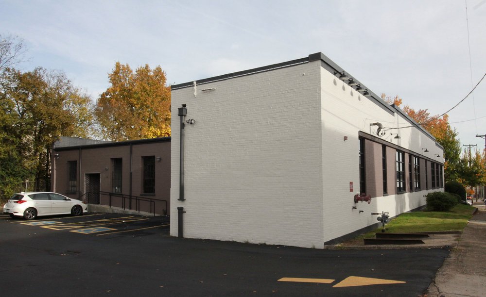 A renovation of a former ice cream factory into office space. A 1970s “update” was removed to restore the large factory windows and Art Deco detailing.